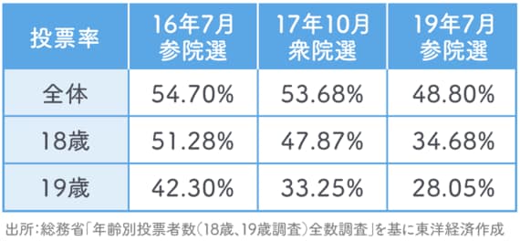 2015年に公職選挙法が改正され、国政では16年の参議院選挙から18歳選挙権が導入されたが、同年7月の参院選では、国民全体の投票率54.70%に対し、18歳の投票率は51.28%、19歳は42.30%。17年10月の衆議院選挙では、国民全体の投票率53.68%に対し、18歳の投票率は47.87%、19歳は33.25%。さらに、19年の参院選では、国民全体の投票率48.80%に対し、18歳の投票率は34.68%、19歳は28.05%と、軒並み減少傾向にある。