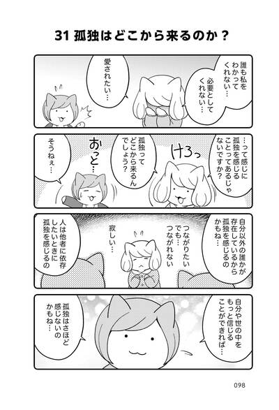 孤独感は、物理的に"1人"というのではなく、感情的な問題です。もともと「だれかとつながっているものだ」という前提があると、つながりを得られないときに、孤独感を味わうことになります。