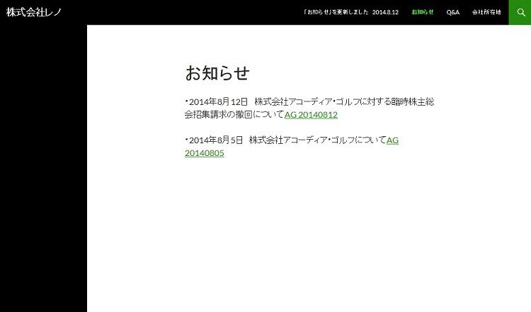 レノが公開した自社ホームページ。極めて簡素な作りで、「レノ」で検索してもたどり着くのは困難