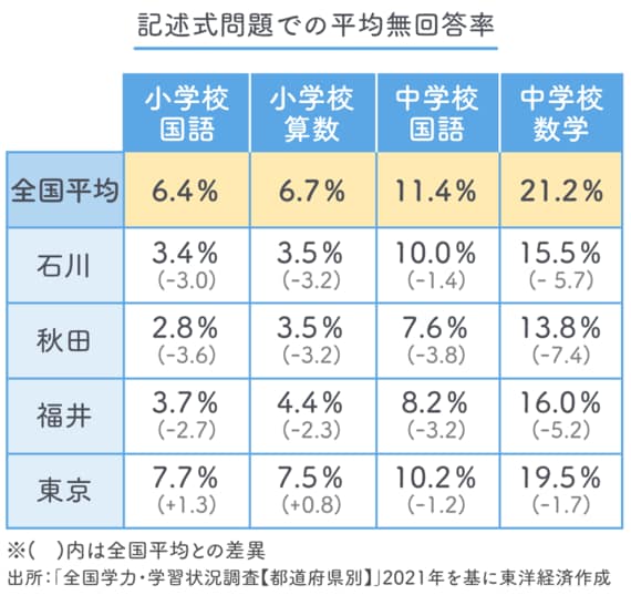 国際調査と国内調査の違いはあるが、そういう状況の中で全国学力・学習状況調査での石川、秋田、福井の無回答率平均は、全体として全国平均よりかなり低かった。とくに記述式に絞ると無回答率平均は同じ上位県でも次のとおりの差がある。