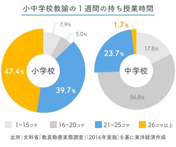 1人の先生が担当している授業数(コマ数)も多い。少し以前のデータとなるが、文部科学省の2016年の調査によると、週26コマ以上担当している小学校教諭は約半数。26コマ以上ということは、ほぼ毎日5~6時間びっしり埋まっている。中学校と高校はそこまでの人はまれだ。しかも、学習指導要領改訂により英語が増えたので、昨年度から小学校の授業負担はこの調査時点よりも増えている。