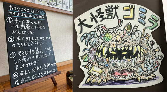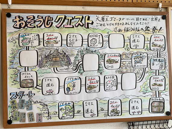さらに、もう一工夫。時間内に掃除を完了できた日は、教室内に掲示された「お掃除クエストマップ」のコマを進めるためのサイコロを振ることができるようにしました(具体的な報酬)。