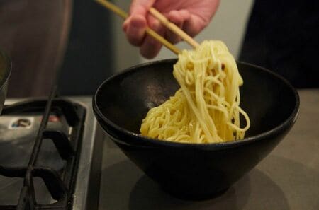 茹で上がった麵を丼に入れて(写真:吉澤健太)