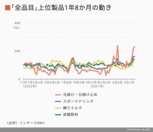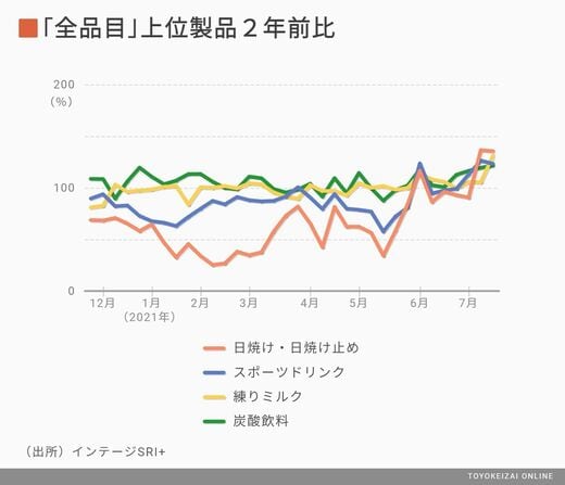 その麦芽飲料に代わって総合1位となったのは、前年比231.4%の日焼け・日焼け止め。日差しが強くなり始めた春先に一度大きく伸びたが、このときは2年前比では7~8割にとどまり、巣ごもりの反動での伸びだった。