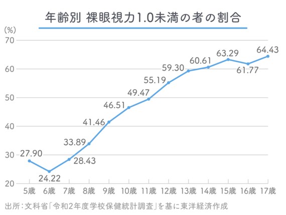 文部科学省が2021年7月に発表した「令和2年度学校保健統計調査」によると、子どもたちの裸眼視力が1.0未満の割合は、小学校37.52%、中学校58.29%と過去最多を更新した。