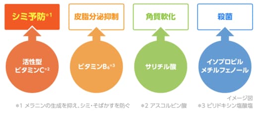 有効成分として働くのがビタミンCだ。これまでスキンケアにあまり気を配っていなかった男性にとってはあまりなじみがないかもしれないが、ロート製薬の担当者によるとビタミンCはシミ予防に効果的な成分の1つ。同社は長年の研究により「一般的には壊れやすく不安定な活性型ビタミンCを安定して配合することに成功した」という。これにより、シミの原因となるメラニンの生成を抑えるとともに、潤いを与えて毛穴を目立ちにくくする効果やニキビ予防、肌のきめを整える働きも期待できるとしている。