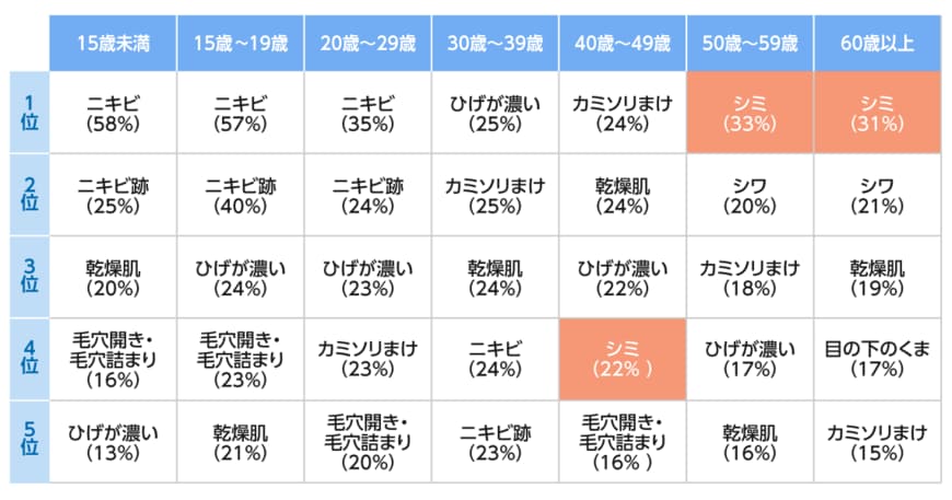 50歳を超えると「シミ」が肌の悩みのトップに