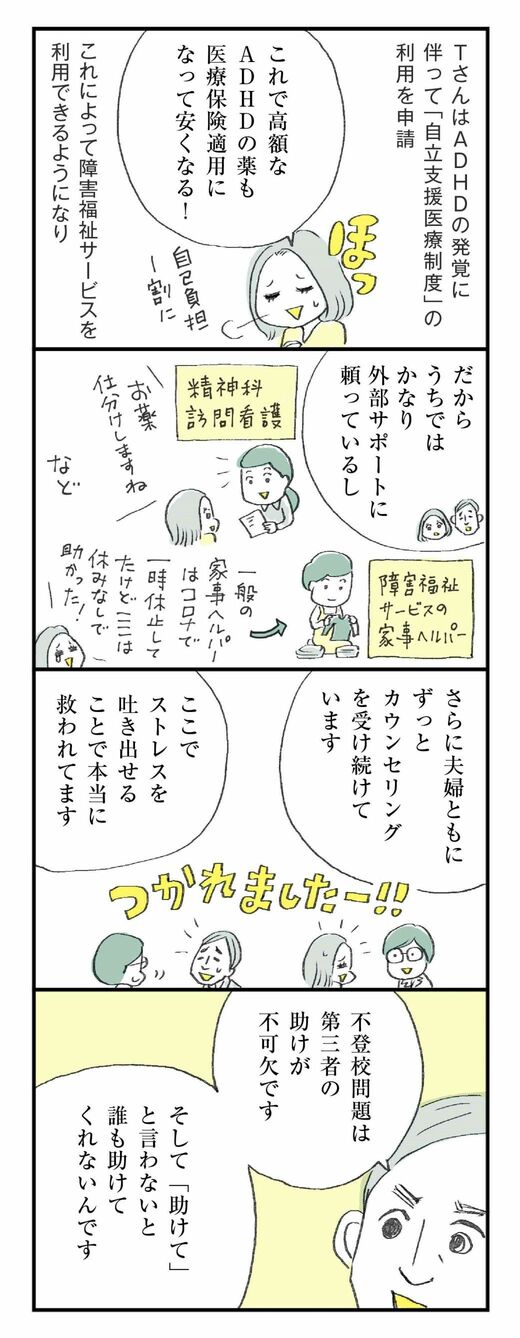 ライフ #ほしいのは「つかれない家族」 前の記事 次の記事 「助けて」娘の不登校で追い詰められた夫婦の決断 つらい状況を「認めたくない」では改善しない 4分で読める 公開日時:2021/10/03 10:00 ハラユキ イラストレーター、コミックエッセイスト フォロー 1/9 PAGES 2/9 PAGES 3/9 PAGES 4/9 PAGES 5/9 PAGES 6/9 PAGES 7/9 PAGES 自立支援医療制度とは? 次ページが続きます:【認めることで道は開ける】 8/9 PAGES 9/9 PAGES