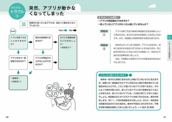 「突然、授業中にネット(Wi-Fi)がつながらなくなってしまった」なんてトラブルも “あるある”ではないだろうか。パソコンのどこ、Wi-Fi機器や無線ルーターの何を確認すればいいのか、どう対処すれば解決するのか、よくわからないのでいろんなボタンを押してみたという経験は誰にでもあるはずだ。授業を中断せざるをえないこともあり、かなり焦るトラブルだが、『学校ICTサポートブック』では “イエスノーチャート”で、今直面しているトラブルの状態を分析しながらベストな解決策にたどり着ける。あると便利、かつ安心といえる一冊ではないか。