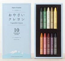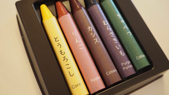 イモムシを引き寄せたのは、「おやさいクレヨン」。ほかに、リンゴ、紫芋、雪ニンジン、ごぼうなど計10種類が1セットになっている。その名の通り、どれも国産の野菜や果物で色付けされている。使われているのは、規格外で廃棄されるものや、加工時にカットされて使われない部分。原料はほかに、ライスワックス(米ぬかの油から採れるロウ)と、野菜の色を補うために食品用の顔料が少し。子どもが誤って口に入れてしまっても安全なように作られた、色も素材も優しいクレヨンだ。