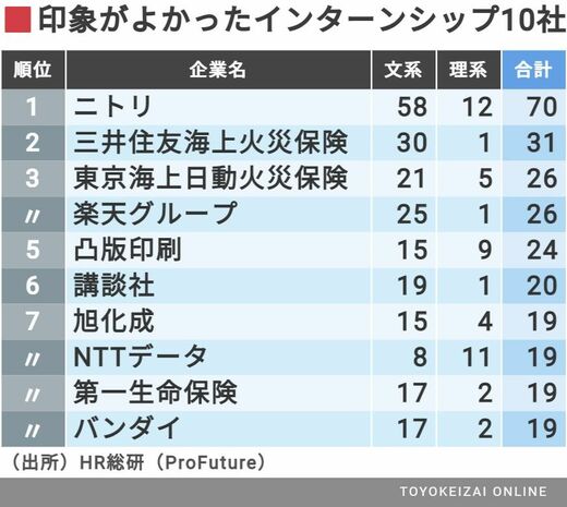 「インターンシップで印象の良かった企業」調査で、ニトリが2位に登場したのは2020年卒だ。2021年卒で1位になり、今回の2022年卒対象調査でも1位である。しかも、票数で2位以下の企業に2倍以上の差をつけている。ニトリは70票、2位の三井住友海上火災保険は31票、3位の東京海上日動火災保険と楽天グループは26票だ。もう1つの特徴は、理系の支持だ。理系12票だが、10位までの企業では最多の票数だ。