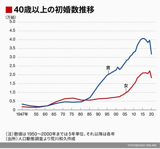 昨今の婚姻減を「未婚化ではなく晩婚化現象」とみる向きもありますが、40代以上の初婚数の長期推移をみると、確かに晩婚化が進行したとはいえ、その伸びは頭打ちとなり、2019年の令和婚特需を除けば、40代以上の初婚も男女とも減少基調にあります。それは、とくに男性に顕著です。