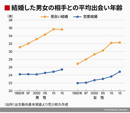 1992年からの推移をみると、女性の場合は出会い年齢がやや遅くなっていますが、これは女性大学進学率の増加とも関連があるといえます。男性の場合は、1992年実績でも24.2歳なのでさほど変化はありません。