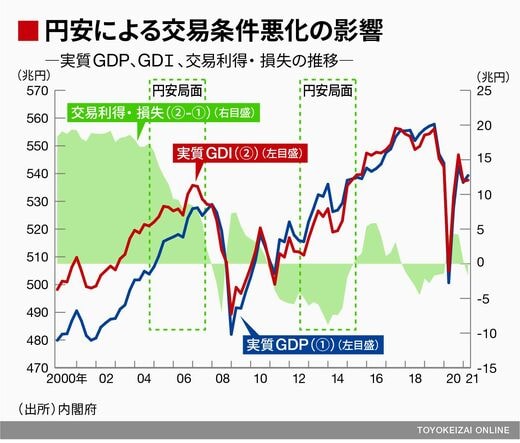 とりわけアベノミクスが喧伝された2012年以降、経済を生産面から見る実質GDPに対して、所得面から見る実質GDIが劣後しているのがわかる。この差が交易損失であり、「GDPの仕上がりが良くても景気回復の実感がない」理由だと筆者は考えている。「実感なき景気回復」の一因として交易条件の悪化(≒交易損失)は看過できない。