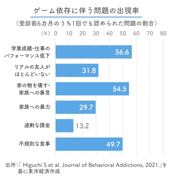 2016年11月~18年8月、久里浜医療センターのネット依存外来でゲーム依存と診断された患者を対象に、受診前6カ月のうち3カ月以上続いた問題の割合を調査。調査対象者は、9~66歳(平均年齢18.2歳)の男女(90.5%が男性)189名