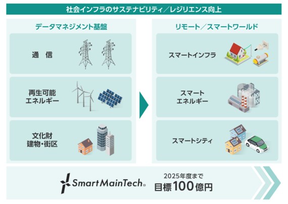 「SmartMainTech」がターゲットとしているのは、「通信」「エネルギー」「街づくり」の3分野だ。NTTグループは、通信設備のみならず、設備運営に必要な電源設備や建物まで保有・管理している。そのためこの3分野はどれも、同社のノウハウを存分に生かしやすい分野なのである。「SmartMainTech」では、2025年度までに累積100億円の売り上げを見込んでいる。