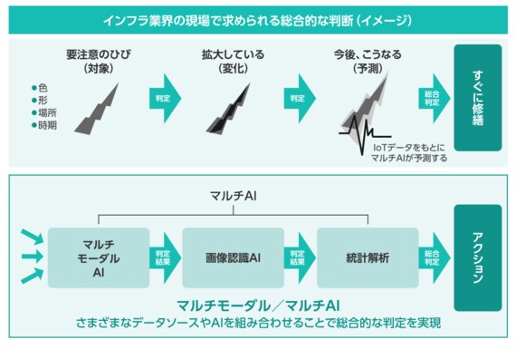 そこで同社は、マルチモーダル(さまざまなデータソースを組み合わせる)や、マルチAI(複数の判定モデルを組み合わせる)の研究開発を加速。ひびの形状だけでなく、「色が白から黒に変化」「時間の経過とともに拡大」といったデータも組み合わせて、緊急度や深刻度を総合的に判断してアクションにつなげていく。