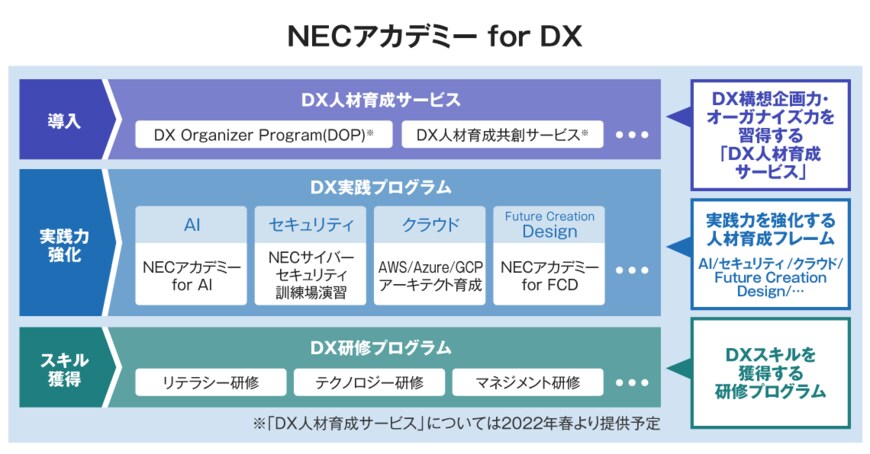 こうしてNEC自身が実践したAI、クラウド、セキュリティ、デザイン思考などの領域における人材育成ノウハウを集結し、お客様のDX人材育成をワンストップで支援する「NECアカデミーfor DX」サービスをご提供しています。まさにNECの知見を集約したメソッドをお客様にもご提供していくことで、日本のDX人材の拡大に貢献していきたいと考えています。