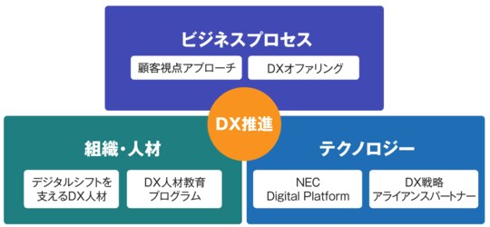 森田 私たちは今、NECのDXとして、お客様のDX=コアDX、社内のDX=コーポレート・トランスフォーメーション、社会のDX=フラッグシッププロジェクトという3つの柱を掲げています。