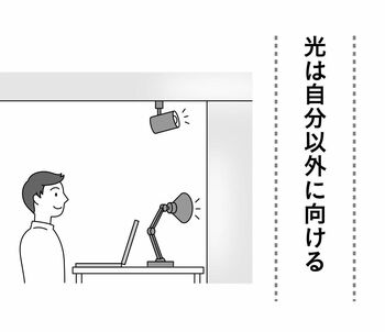 ここでは光の向きを要チェック。デスクライトやスポットライトが自分に向き、ときどきでも目に直接光が入ってくることがあるなら、今すぐ向きを変えましょう。