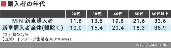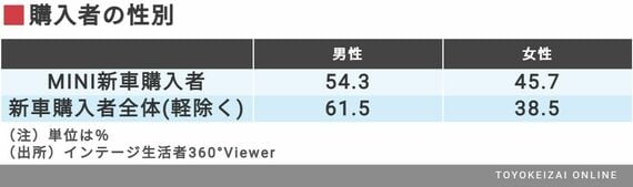 まずは、購入者の性別と年代構成から確認していく。MINI新車購入者を新車購入者全体(軽自動車を除く)と比較していく。すると、年代構成に大きな違いはないが、女性比率が高いことがわかった。