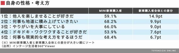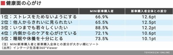 MINIオーナーは女性比率が高いためか、見た目や美容に類する項目で差分が大きくなっている。デザインに特徴のある車種だけに、車だけでなく自身の見た目にも人一倍気を使っているのかもしれない。
