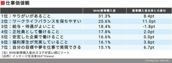 「仕事価値観」というデータがあるので見てみよう。MINI新車購入者の「スコアが高い順」にソートした結果が次のとおりだ。