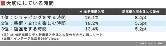 すると、差分の大きかったトップ3は「ショッピング」「芸術・文化を楽しむ」「勉強する時間」となり、MINIオーナーは自身の成長や楽しみのための時間をより大切にしていることがわかった。