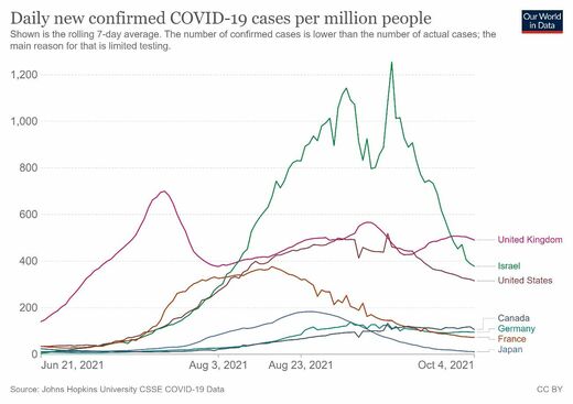 日本同様、イスラエルでも6月下旬からデルタ株による感染者が増加した。夏の流行のピークは9月14日で、新規感染者数は1254人(人口100万人あたり)で、同国の冬のピーク(981.2人)を大きく上回った。日本の今夏のピークの6.8倍に当たる。今夏、イスラエルの感染者数は、G7諸国よりはるかに多かったが(図2)、これはワクチンの効果が切れた時期に、デルタ波の流行が重なったためだろう。ワクチンの感染予防効果は、接種からの時間とともに減衰することを、認識しなければならない。