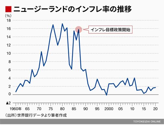 1988年の初めに、ニュージーランド連銀がインフレ率を下げることに言及した政策を設けたところ、間もなくインフレ率が下がり始め、1989年に2%というインフレ率の目標が設けられて、さらにインフレ率が下がりました。インフレターゲット政策が成功したと世界中から注目を集めました。