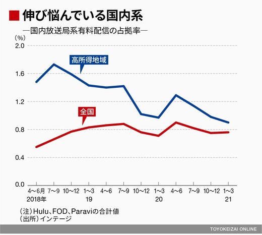 一方で国内の放送局が運営する有料配信サービスの占拠率は全国平均で0.8%前後のままであり、全体としては占拠率が上昇している配信領域にあって停滞してしまっている。