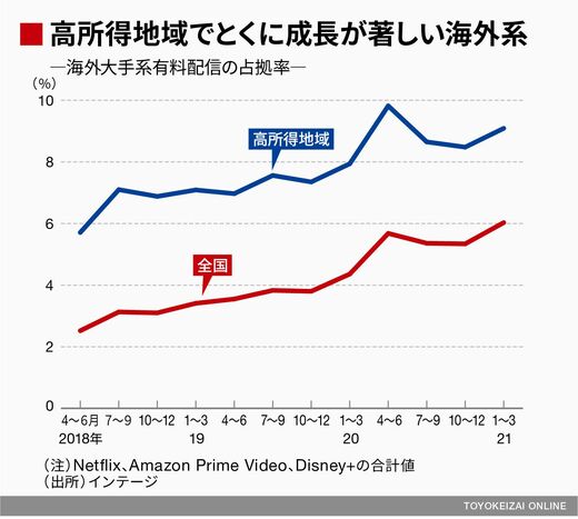海外大手プラットフォーマーの有料配信サービスの占拠率はとくに高所得地域で高く、2021年1~3月期には9%にも達している。さらに高所得地域、全国平均のどちらでも占拠率が上昇傾向であり、テレビ受像機における存在感が日に日に大きくなっていることがわかる。