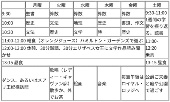 それではエリザベスが学んだ時間割を見てみよう。この時間割は10歳にもならない子どもの頃のものであるが、想像以上にぎっしりと詰め込まれた時間割には、未来の国王として身に付けるべき帝王学が集約されている。