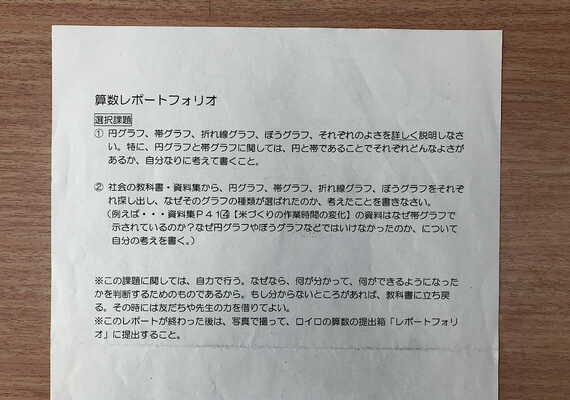 児童は単元の内容を「理解できた」と思えたら、共通課題「レポートフォリオ」に取り組む。これは理解度の確認を目的としており、例えば「社会の教科書や資料集からグラフを探し出し、なぜそのグラフの種類が選ばれたかを書きなさい」など、学んだことをアウトプットする内容にしている。