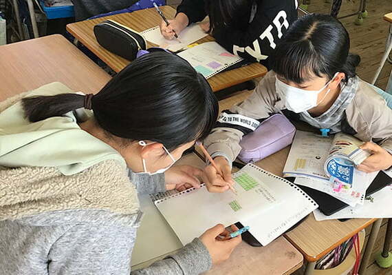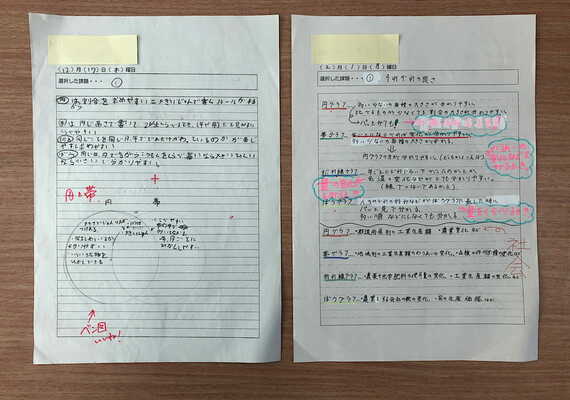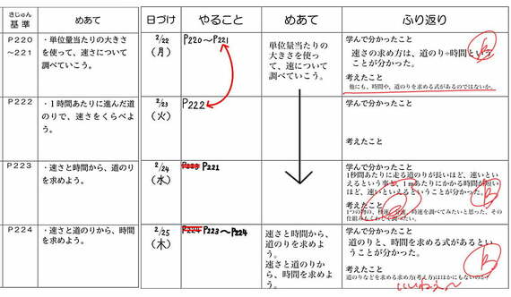 毎時最後には、学んだことや考えたことを「ふり返り」として計画表に記入。そして次時に進捗を踏まえて計画を赤字で修正する。これを繰り返すと、自分の学び方がつかめてくるようで、計画表の修正は減ってほぼ計画どおりに進むようになるという。