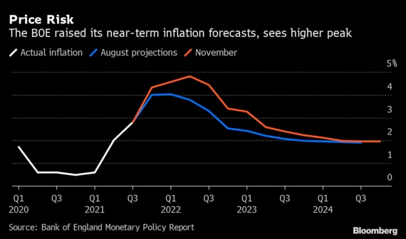 この予測によると、消費者物価のインフレ率は2022年4月に5%に達する見込み。当局者の大半はこれを一時的と見なしている。また、インフレ高進を防ぐために金融政策でできることはほとんどないと中銀は強調した。