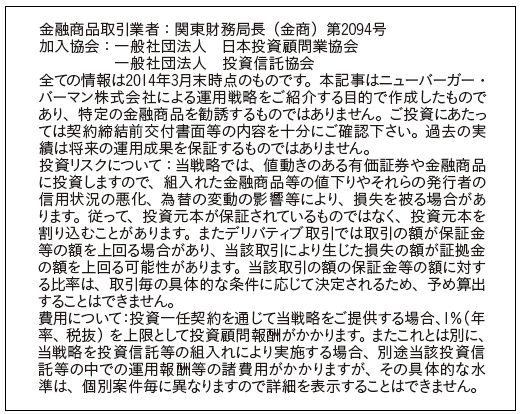 ニューバーガー・バーマンでは、これらの声に応えるために、「リキッド・オルタナティブ」という商品を開発し提供を開始した。リキッド・オルタナティブは、原則として成功報酬を徴収せず、透明性や日次の流動性をヘッジファンド投資で可能にし、ポートフォリオの分散化、安定化が期待できるとして、米国では401kや公募投信にも採り入れられている次世代型のヘッジファンド投資である。このような戦略にようやくさまざまな投資家がアクセスできるようになったことはうれしい。