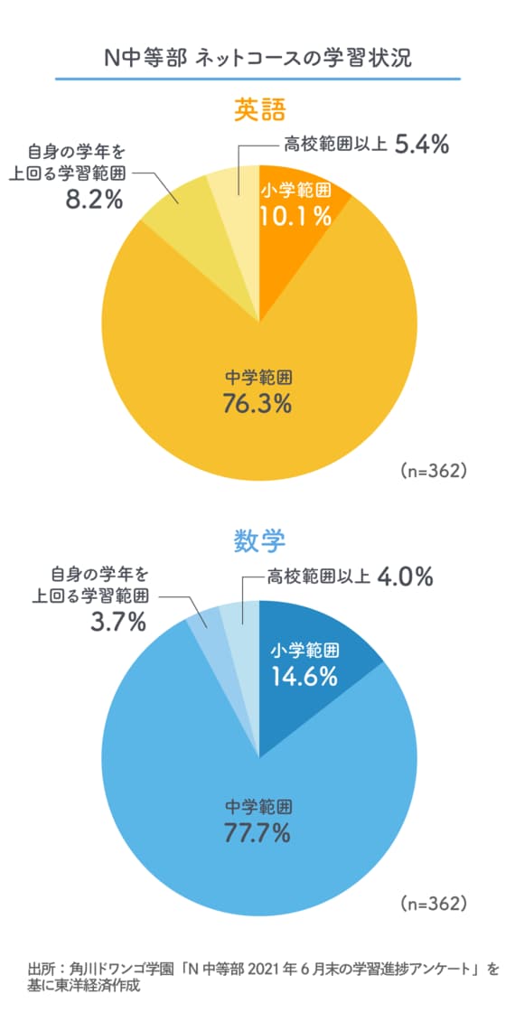 N/S高のネットコースは、自分のペースで学習を進めるコースだが、N中等部が通学コースに加えて開設したのは「オンライン上に少人数で集まって学習する」ネットコース。高校生なら自主性に任せられるが、さすがに中学生では難しいと考えたのだ。さらにN中等部では、そうした未熟さを補うため、自習のときなどに質問ができるようチューターを配置している。