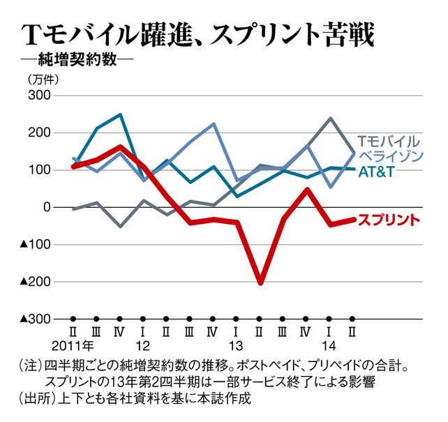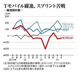 米国市場では、2強が市場の7割を占拠する。スプリントは契約数の純減が続き、独り負け状態。一方、次々と画期的な料金プランを打ち出し、契約数を増やして猛烈に追い上げるのがTモバイルだ。