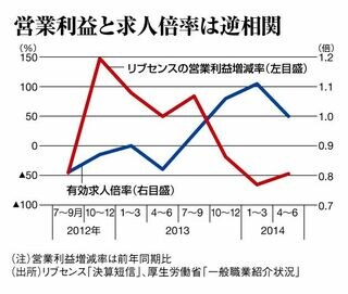 一定期間(通常2カ月)内の求人数に対し、どれぐらい求職者がいるかを示す有効求人倍率。これとリブセンスの業績は逆相関している。有効求人倍率は2013年11月に人手不足の目安となる1.00倍を約6年ぶりに上回った。一方、リブセンスの2013年第4四半期(10~12月期)営業利益は前年同期比マイナスに転じた。