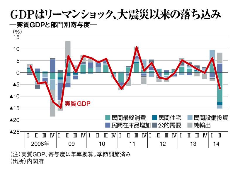 実質GDPは年率マイナス6.8%で、1~3月期の年率プラス6.1%から大きくダウン。今年4月の消費増税による駆け込み需要とその反動減の振幅は、政府やエコノミストの大方が当初に想定したよりも大きかった。