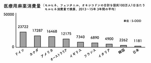 ところが、これまでの研究の結果、痛みのある人に医師の指示に従って適切に医療用麻薬を使ったときには、このドパミンは働かず、麻薬中毒になる心配はほとんどないことがわかっています。日本では、欧米に比べて医療用麻薬の使用量が少なく、痛みを軽減する緩和ケアが適切に実施されていない恐れがあります(図1)。医療用麻薬は体の痛みや息苦しさを減らすために不可欠な薬であることを知っていただきたいと思います。 (長尾クリニック院長 長尾和宏医師)