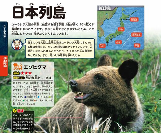 【エゾヒグマ】ヒグマの亜種で、北海道に棲んでいます。おもな食べ物は草や果実などですが、出会った人間を傷つけることもあり、北海道では昔から恐れられています。頑丈なあごにするどいきばが生え、マスやサケなどの魚も食べます。