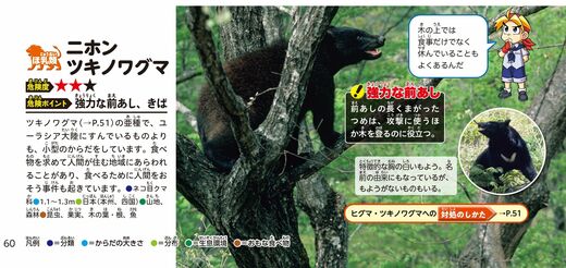 【ニホンツキノワグマ】ツキノワグマの亜種で、ユーラシア大陸に棲んでいるものよりも、小型です。食べ物を求めて人間が住む地域にあらわれることがあり、食べるために人間を襲う事件も起きています。前あしの長く曲がったつめは、攻撃に使うほか木を登るのに役立ちます。胸にある月型の模様が名前の由来になっていますが、模様のない個体もいます。