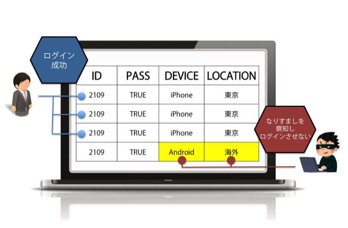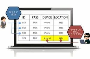 これは「その人らしいログインかを判断する技術」(島津氏)。関東地方からログインしたのに、1時間後に広島でログインしたら、それはなりすましではないかと判断するのである。具体的にはIPアドレスと時間帯をもって、どこからどの端末を使ってログインするかを、学習する。おかしいと思われるログインがあり、高い確率で本人ではないと判断すると、サービス提供者に情報を提供する仕組みだ。