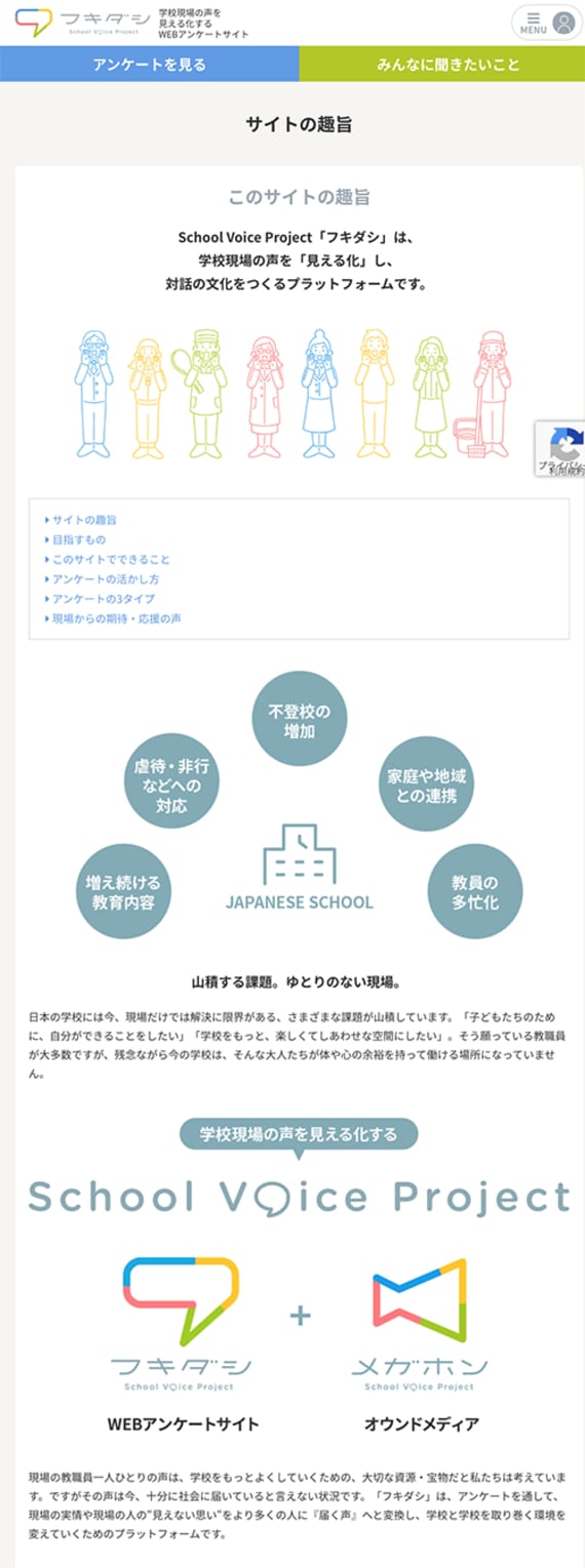 利用できるのは、全国の小学校〜高校年齢の児童生徒が通う一条校に勤務する教職員で、ユーザー登録制(無料)。登録者に対し、Webアンケートサイト「フキダシ」で、「小学校高学年の教科担任制について」「一人一台端末のトラブル・課題」など、主に公立学校の教育現場で起こりうる議論や課題をテーマにアンケートを行い、届いた回答結果や事例、エピソードなどをわかりやすくまとめて形にし、オウンドメディア「メガホン」で発信する。