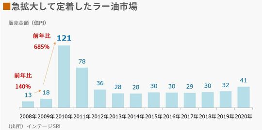 2009年に発売された食べるラー油に牽引され、ラー油の市場規模は前年比140%まで成長。さらに各社から相次いで食べるラー油が発売されブームの勢いは強まり、2010年には前年比685%まで伸長しました。市場規模は、2008年の13億円から2010年の121億円へと10倍近くにまで拡大したのです。