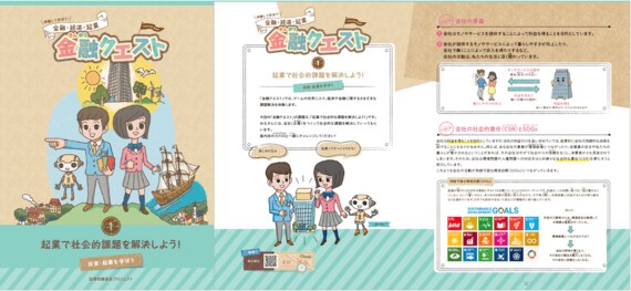 次は「体験して学ぼう! 金融・経済・起業 金融クエスト」。こちらは新学習指導要領に対応した教材で、主に中高生向けの内容だが、高校の新科目「公共」や「家庭科」の授業でも利用できるようになっている。グループワークなどの体験学習を通じて、起業や投資の意義、間接金融と直接金融、株式会社の仕組みや、社会の変化と会社への影響、資産形成などについての関心と理解を深めることを目的としている。新たな金融経済の知識についても幅広く網羅されており、「株式会社をつくろう!」と同じ体験型教材だ。5種類のテーマについて、各テーマごとに50分の授業で完結できるように設計され、使いやすいことが特徴となっている。