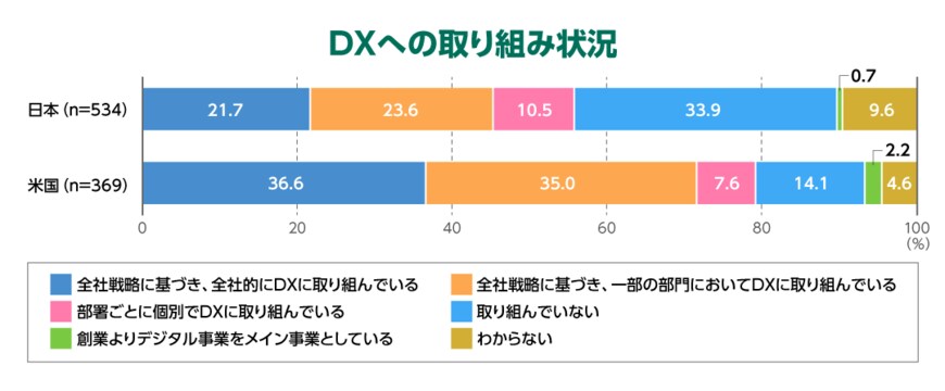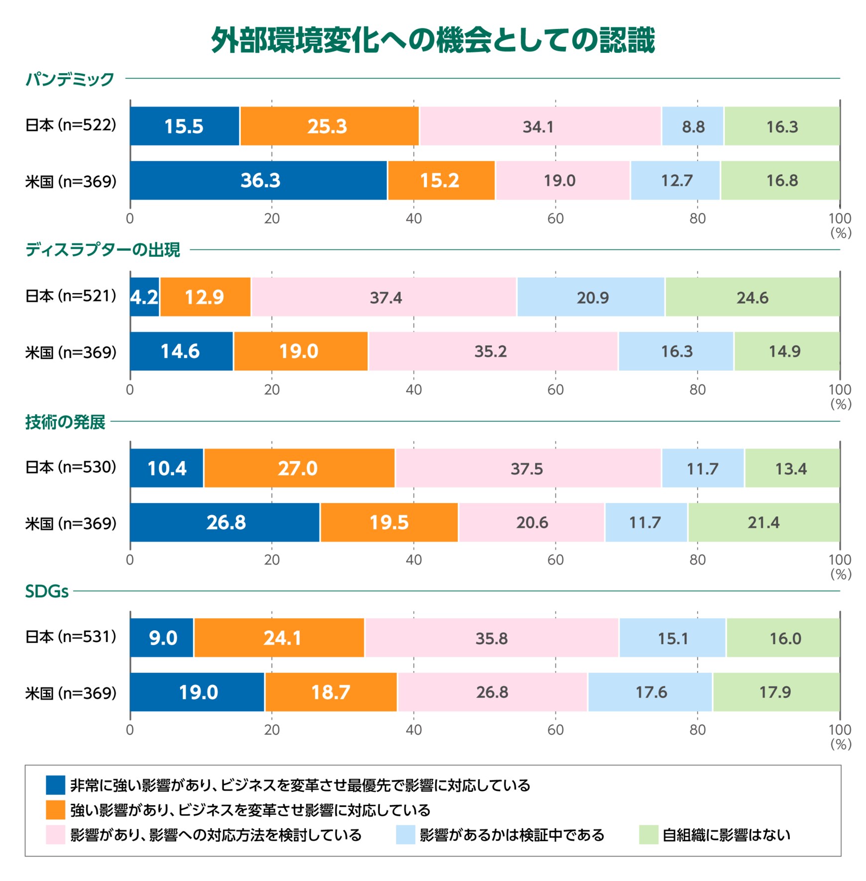 とくに差が大きかった環境変化は「パンデミック(日本15.5%、米国36.3%)」「技術の発展(日本10.4%、米国26.8%)」。日本企業は、コロナ禍やイノベーションによるデジタル技術の刷新を、自社の成長に結び付けようとする意識が乏しいことが明らかになった。