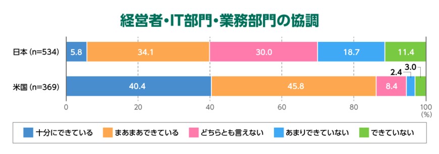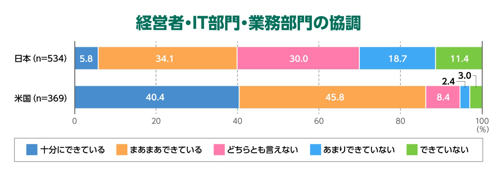 前述の「DX白書2021」によると、「経営者・IT部門・業務部門の協調」について、「十分にできている」「まあまあできている」と回答した米国企業は86.2%だった。それに対して、日本企業は39.9%と、なんと半分以下だ。